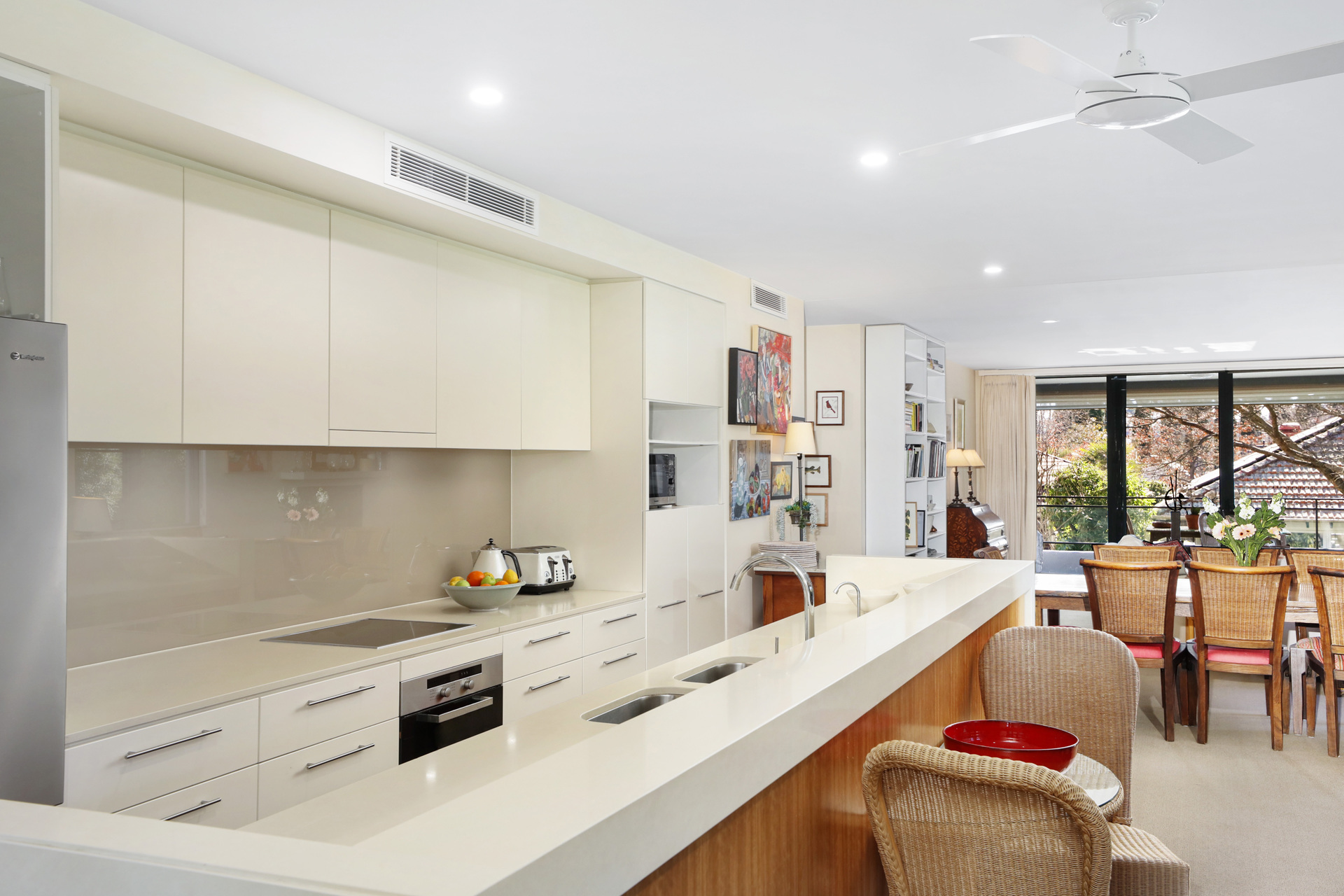 - Living zone and entertainers terrace bask in a prized north/east-facing aspect - Open plan stone kitchen with induction cooking and Miele appliances - Master suite includes ensuite bathroom and built-in robes for convenience - Two additional double bedrooms both feature built-in robes for storage - Luxury bathrooms with floor to ceiling tiles and underfloor heating installed - Reverse cycle air conditioning and a cozy gas fireplace enhance comfort - Beautifully designed bookcases separate spaces and add quality detail - High ceilings, intercom entry, lock-up garaging for two cars, storage space - Lift from garage or ground floor plus convenient visitor parking available - Access to indoor swimming pool, gym, and lush leafy common gardens
