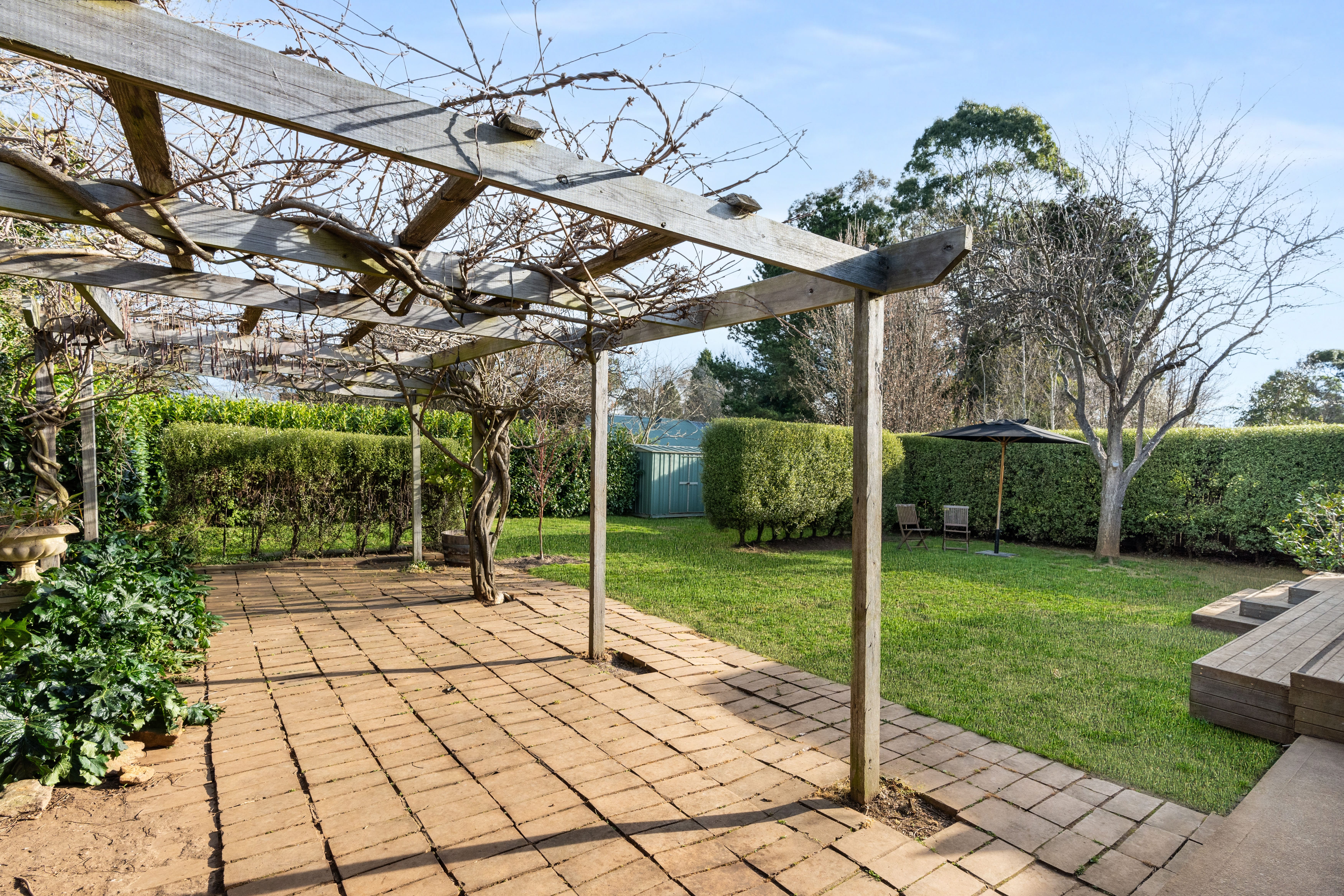 Enchanting Outdoor Spaces: The meticulously designed gardens are a visual masterpiece, featuring a birch grove, wisteria-draped trellis, camellias, cherry blossoms, and established hedges that offer both beauty and privacy. An automated irrigation system keeps the gardens lush and vibrant, while a discreetly placed garden shed provides practical storage.