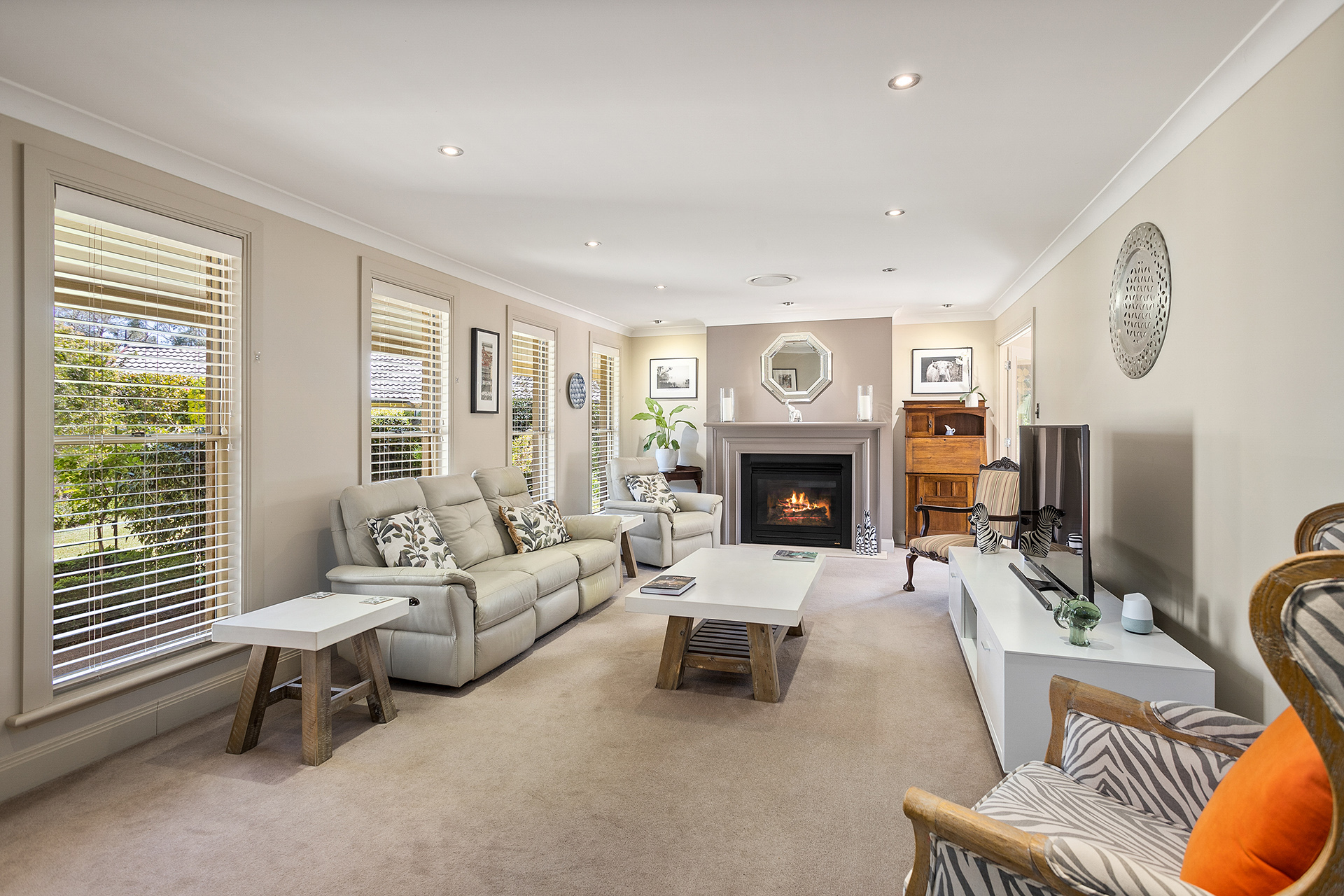 An elegant lounge room with a cosy gas fire *