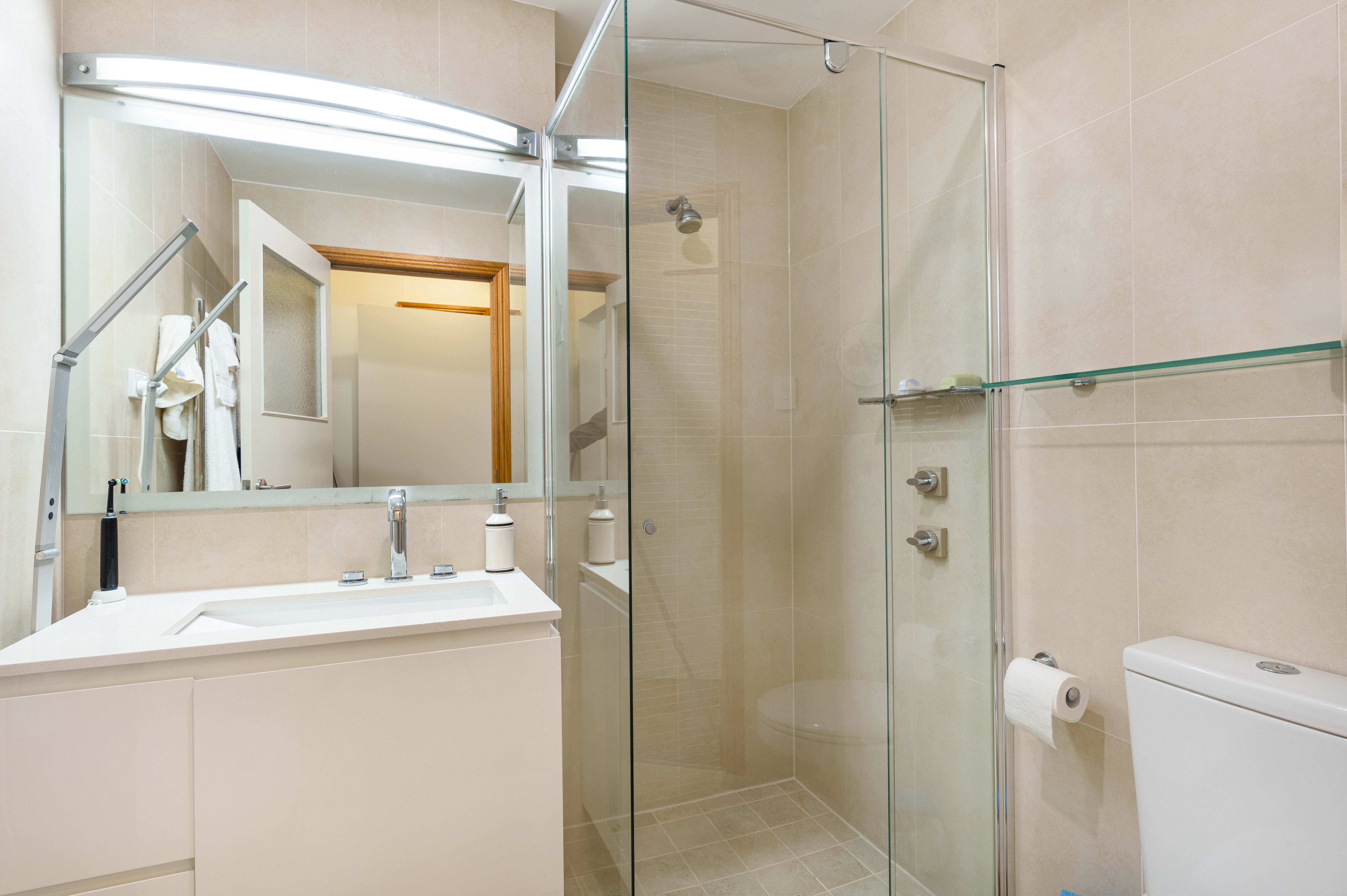 Retreat to the spacious master bedroom, complete with a private ensuite, walk in robe and views of your private outdoor landscape. Two additional bedrooms (one set up as a study) provide plenty of space for family or guests, complemented by a well-appointed and renovated main bathroom.